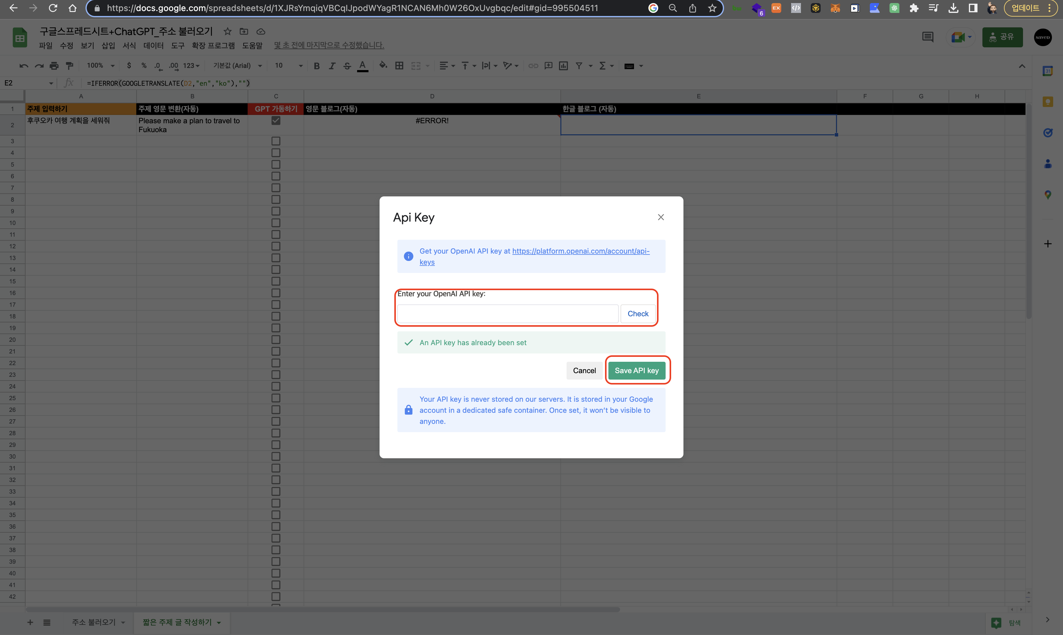 2. 구글 스프레드시트에서 ChatGPT API 사용하기
