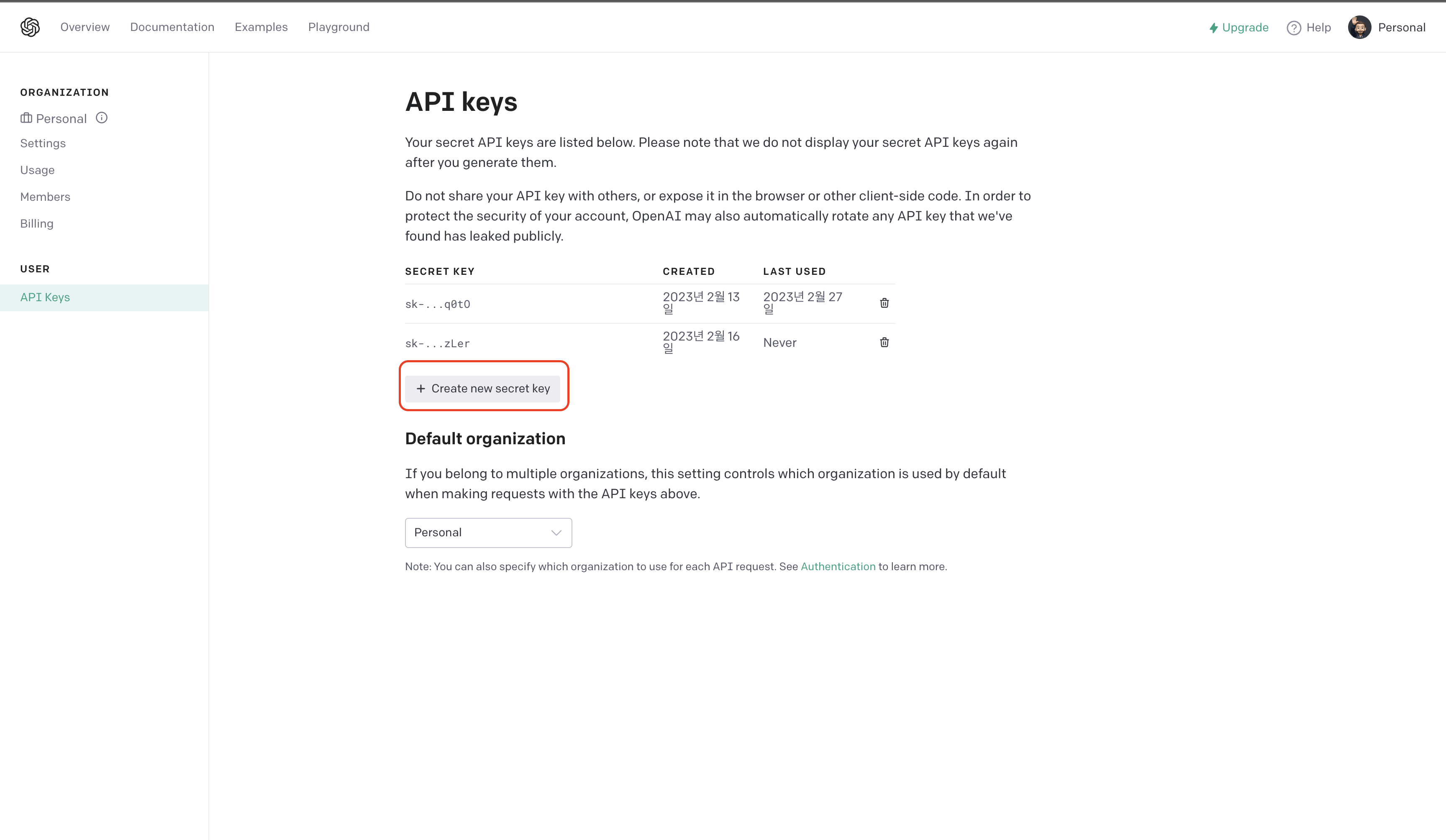- Create new secret key를 클릭해서 내 API Key를 발급받고 복사해두기 (아래 이미지 참조)