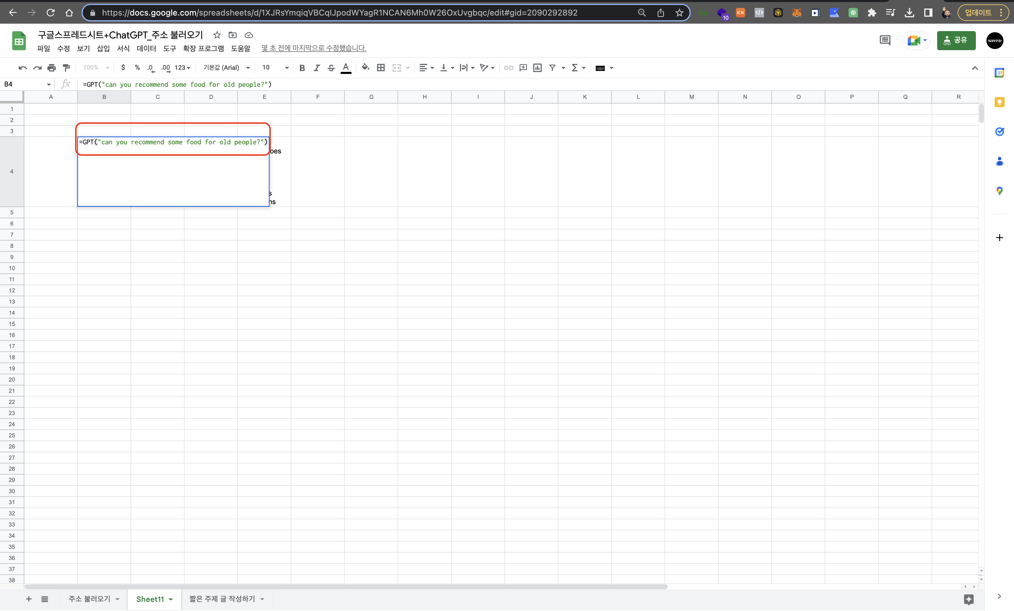 - 이제 여러분의 구글 스프레드시트에는 GPT API가 붙여져있다