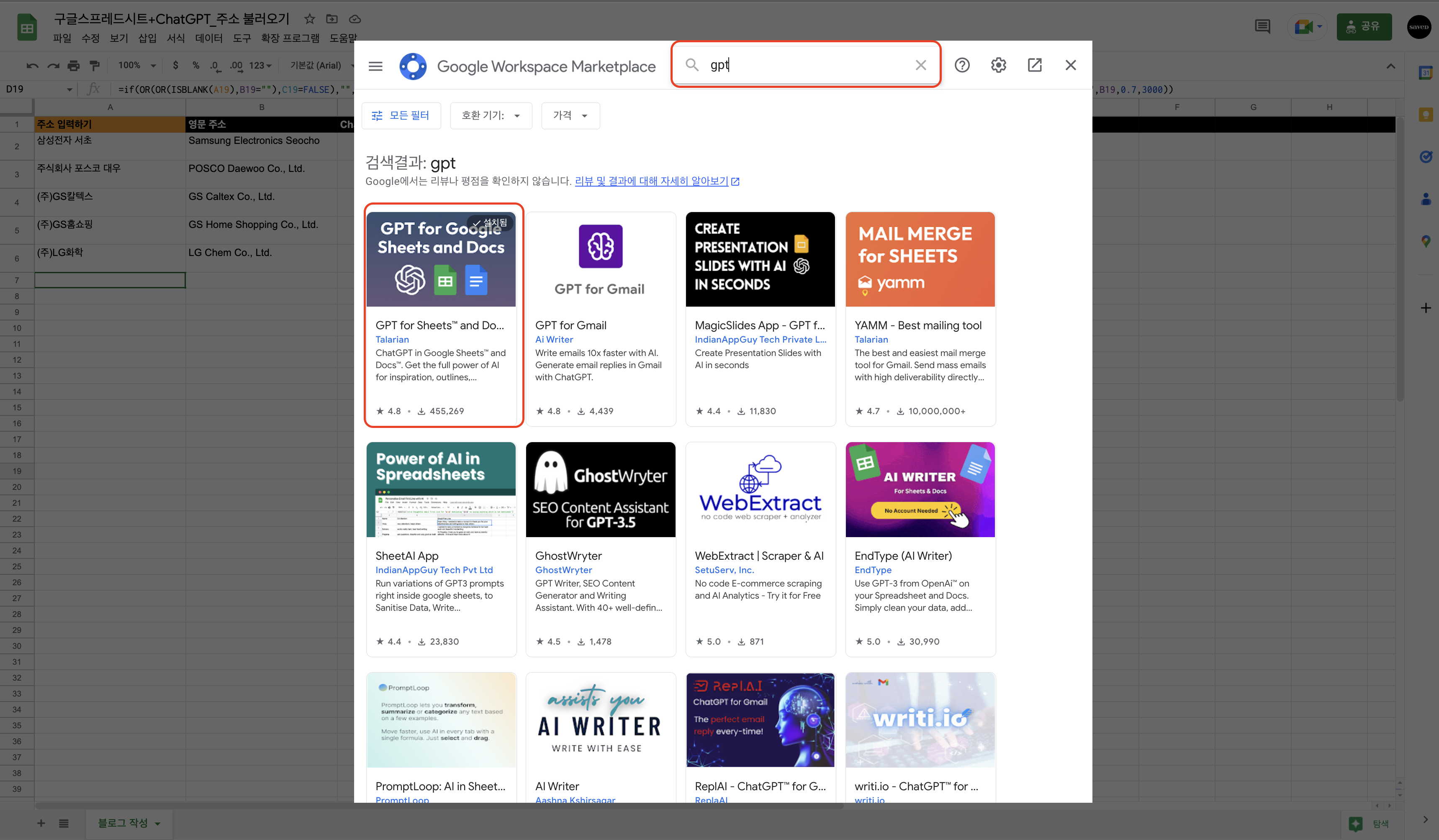 - gpt 검색해서 GPT for Google Sheets and Docs 설치하기 (아래 이미지 참조)