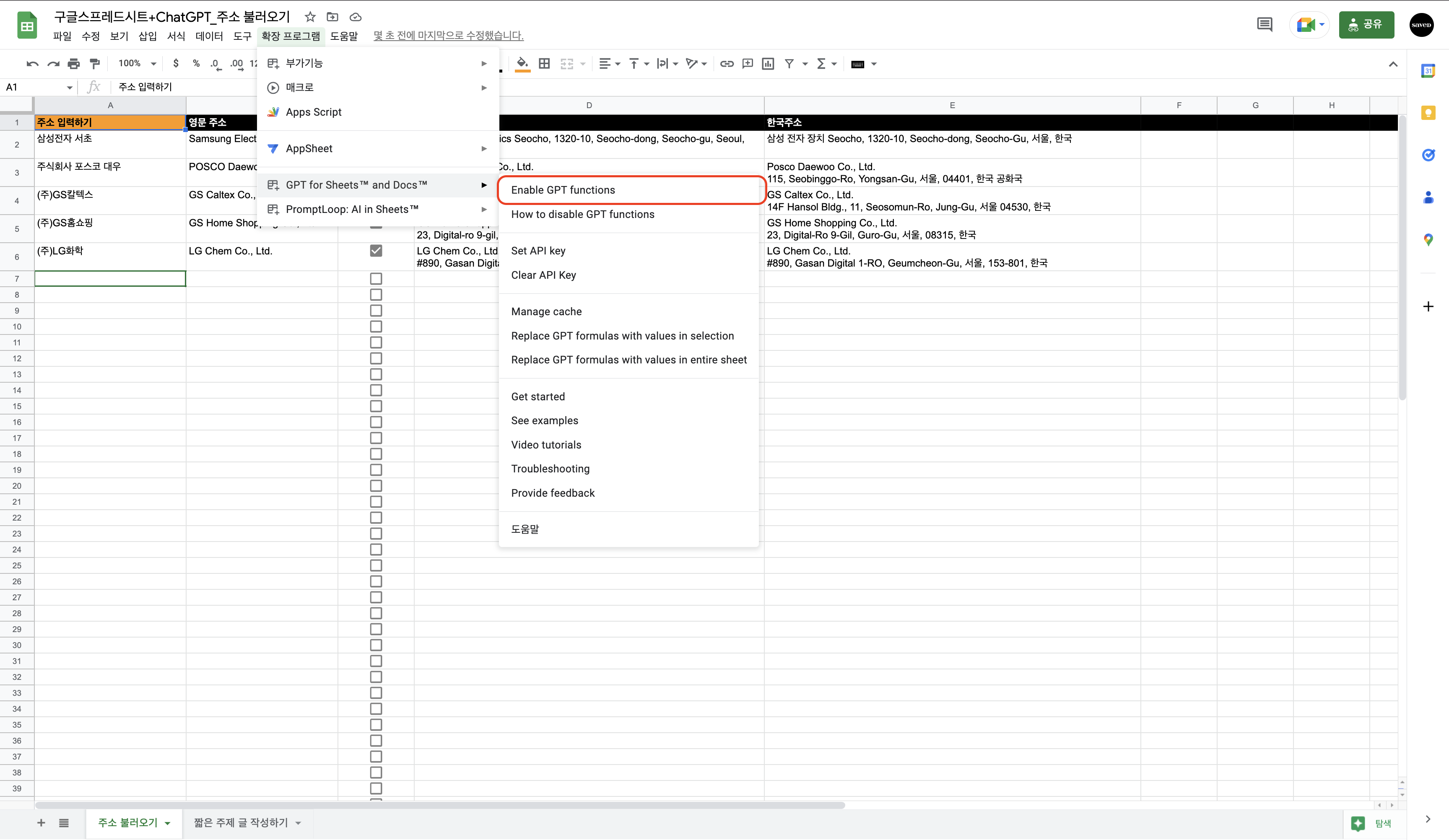 그럼 어떻게 구글 스프레드시트에서 ChatGPT를 쓸 수 있는지 알아보겠습니다.