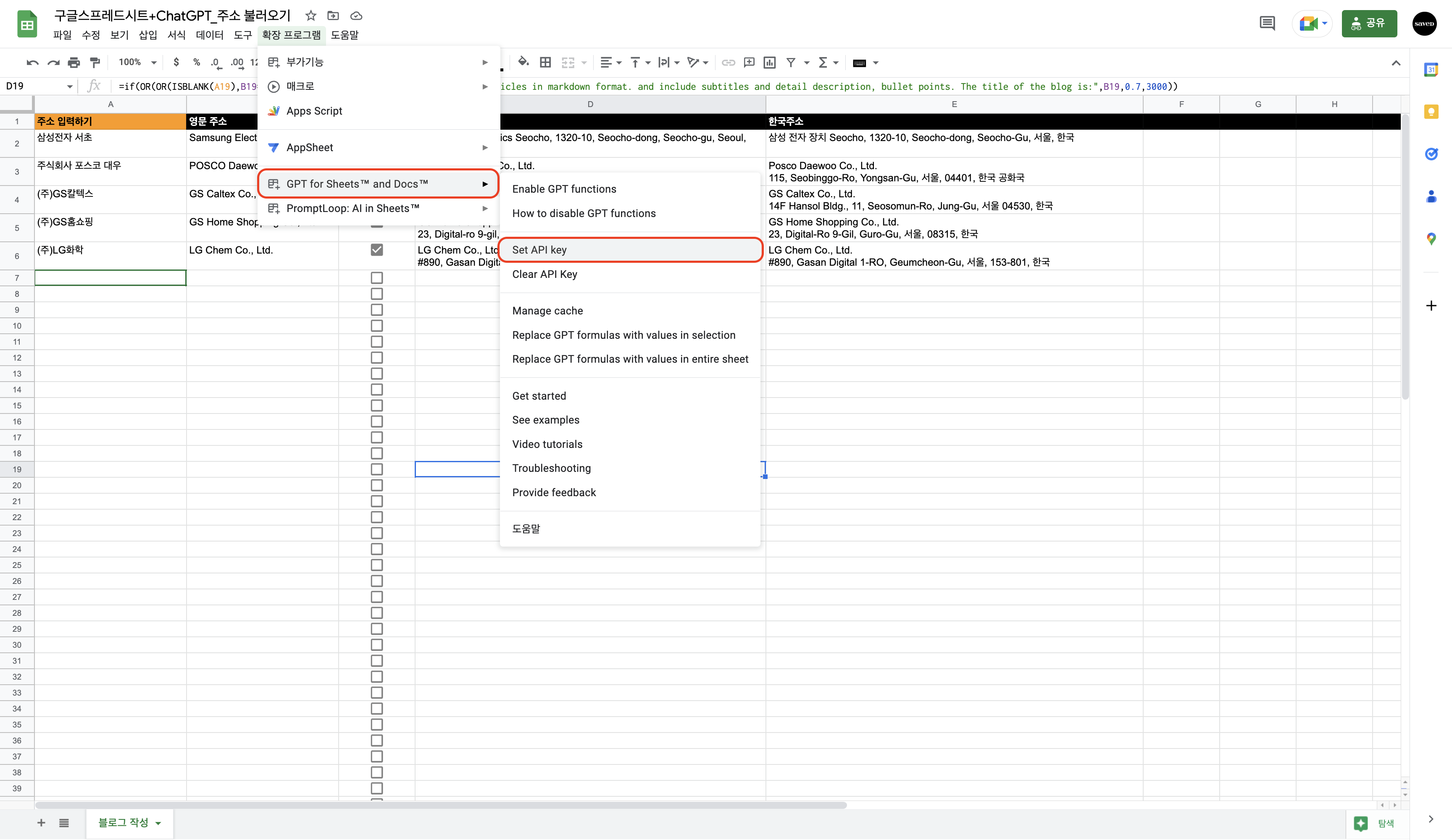 - 메뉴 - 확장프로그램 - GPT for sheets and Docs - Set API Key (아래 이미지 참조)